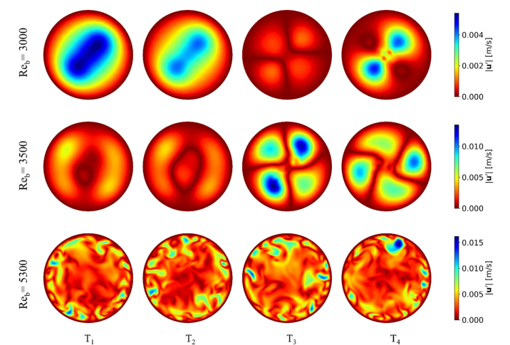 Figure: Instantaneous snapshots of fluctuating velocity magnitude across the middle cross-section of the pipe at four successive times from left to right: T1 = 1/4 Teddy, T2 = 1/2 Teddy, T3 = 3/4 Teddy, T4 = 4/4 Teddy. From top to bottom, the results correspond to Reb = 3000, 3500 and 5300, respectively.